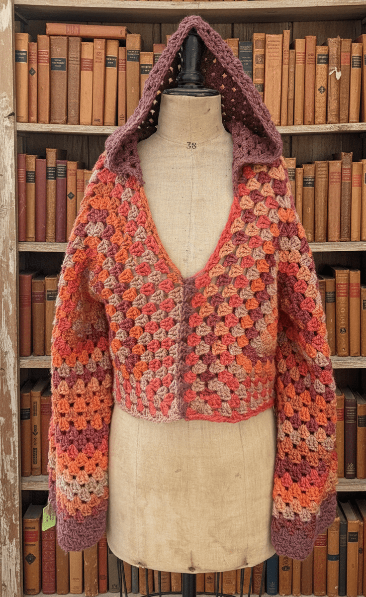 Each stitch is worked by hand using plush, acrylic yarn that’s lightweight yet warm—ideal for crisp mornings, craft markets, or layering up for spooky-season outings. The hood adds a touch of cozy charm, while the granny-stitch texture gives it that nostalgic, handmade-with-love feel.