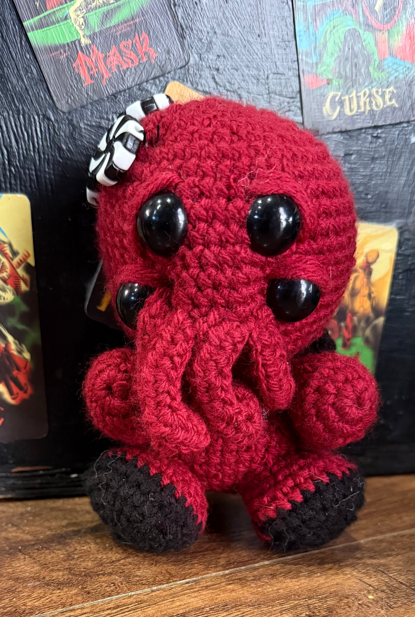 Crocheted from deep crimson yarn and standing approximately 6 inches tall, this eldritch cutie features glossy black safety eyes, soft tentacles, and striped peppermint-style horns for a darkly whimsical touch. Each one is carefully crafted to bring together the worlds of cute and creepy, making it a perfect stocking stuffer or gothic holiday decoration.