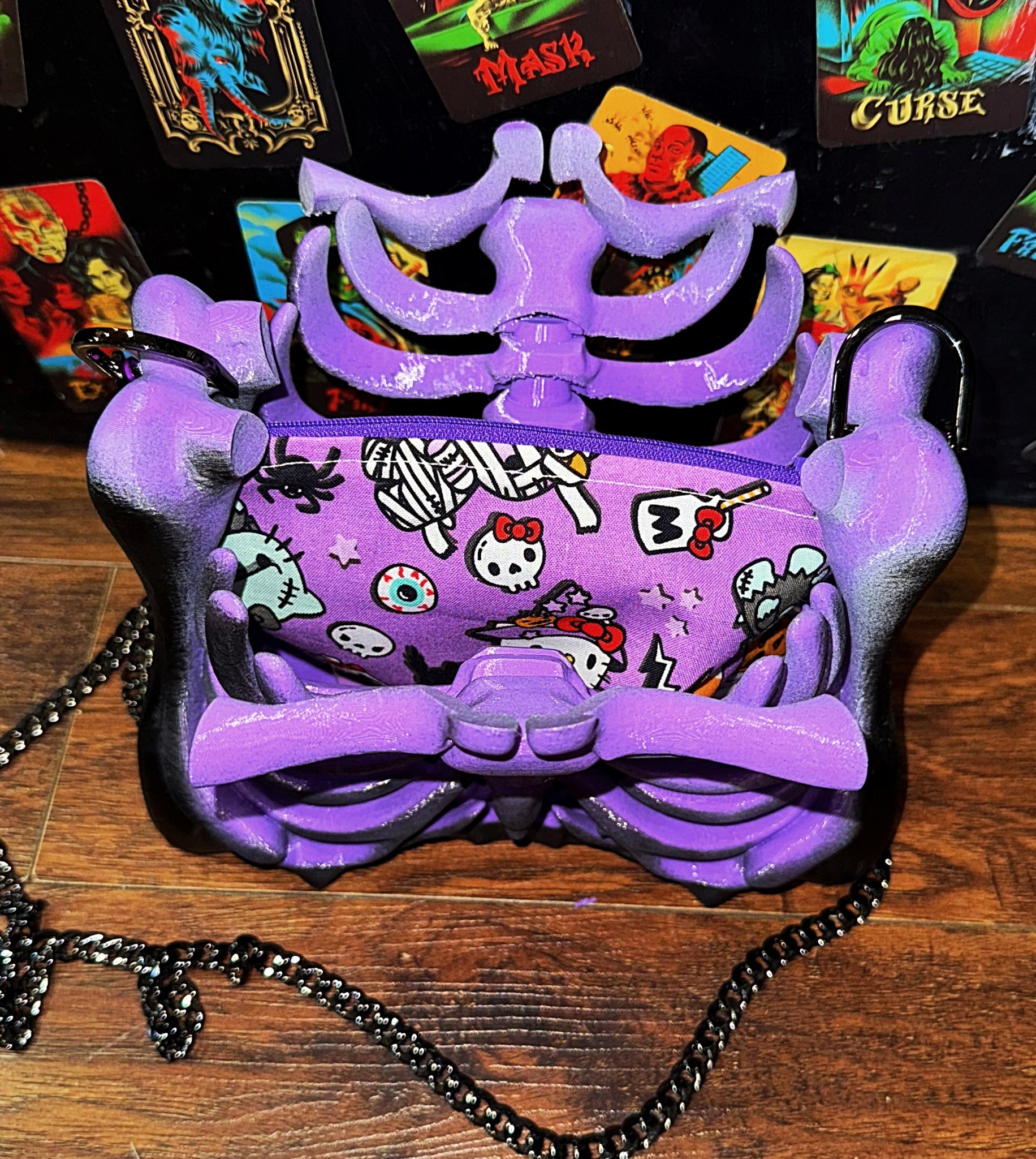 Turn heads with this one-of-a-kind ribcage bag — bold, spooky, and surprisingly practical. The hand-painted black finish with purple accents makes it a relaxing and spooky piece, while the durable design keeps it ready for daily adventures.