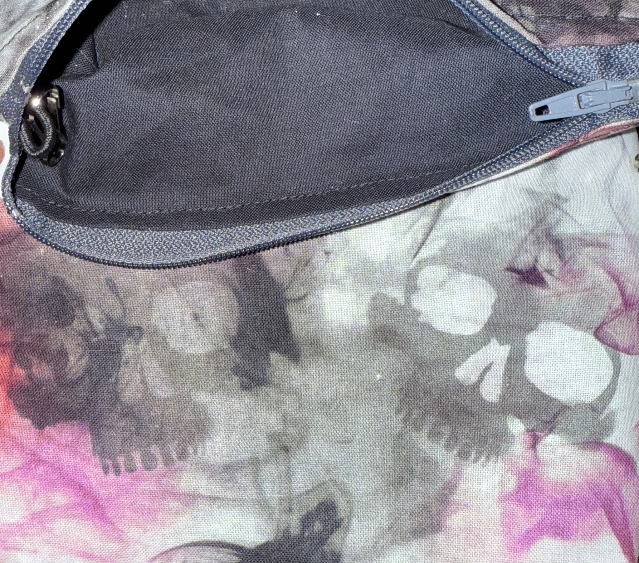 This hauntingly beautiful lining features wisps of smoky black and violet drifting across a backdrop of eerie skulls, giving it a moody, ghostly effect. Finished with a dark grey zipper and a black inner lining, it’s the perfect choice for anyone who loves a more subtle yet spooky vibe.