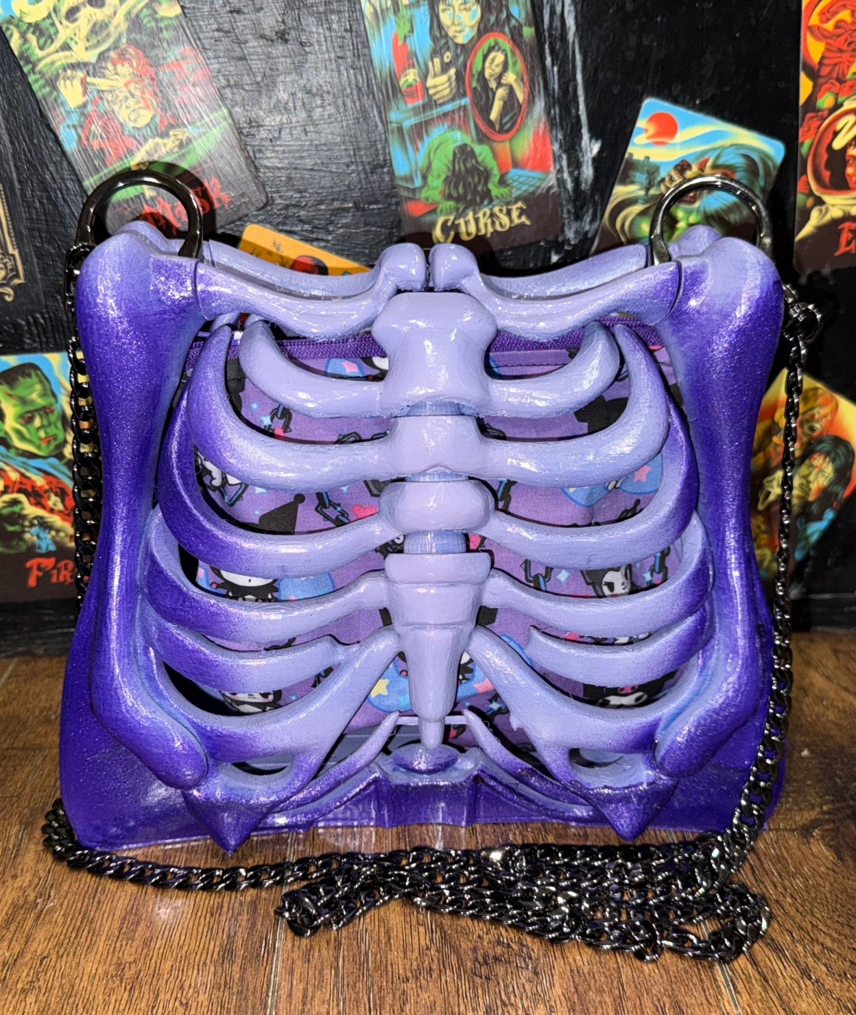 Creep it cute with this one-of-a-kind ribcage crossbody bag, hand-crafted with pastel goth vibes. Each bag features a pastel lavender to bright glitter purple ribcage shell with a removable, zippered fabric liner inside—making it as practical as it is spooky-sweet.