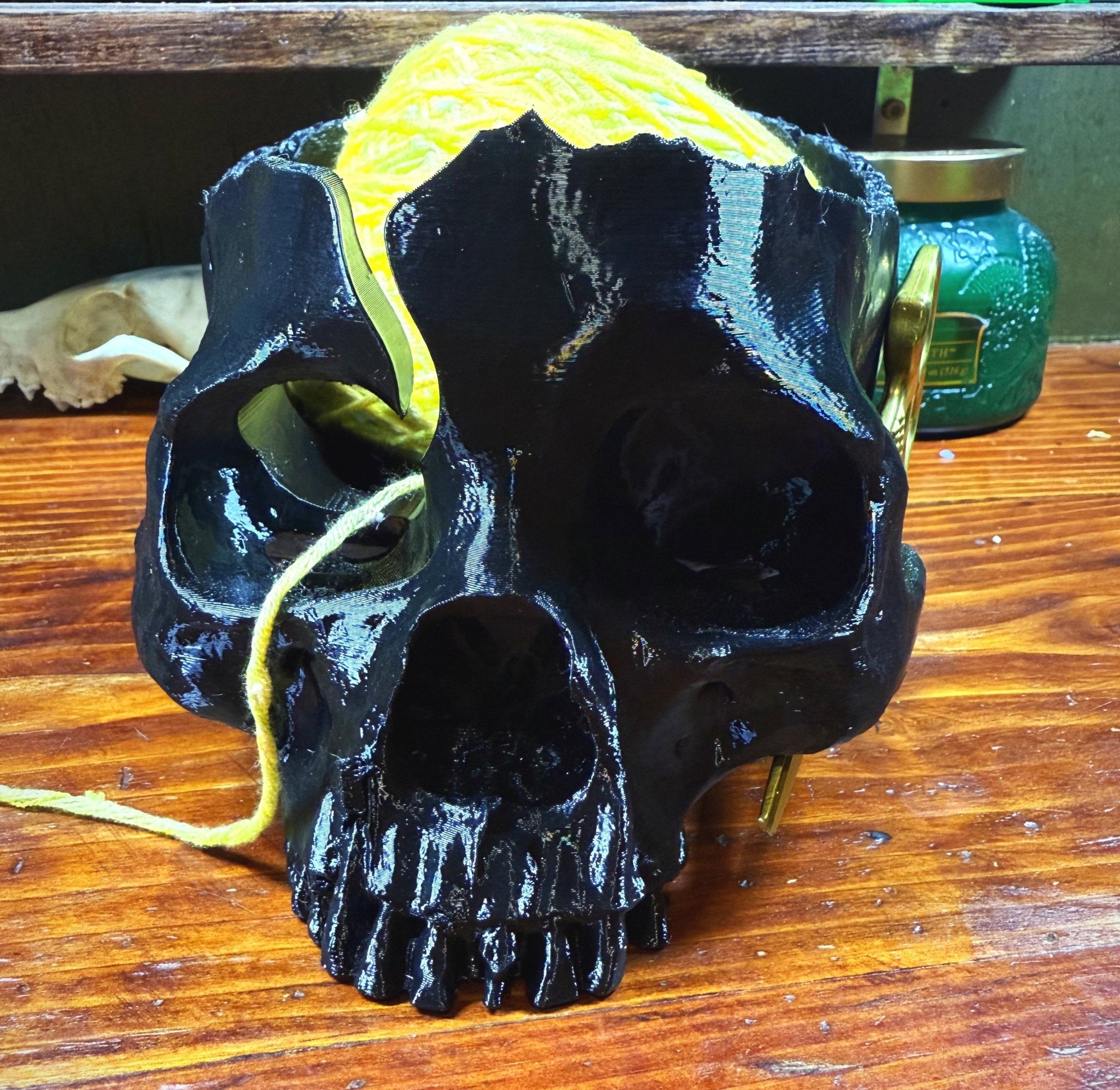 Unleash your creativity with this hauntingly beautiful 3D-printed skull yarn bowl! This unique yarn bowl keeps your yarn tangle-free while adding a bold, gothic touch to your crafting space.