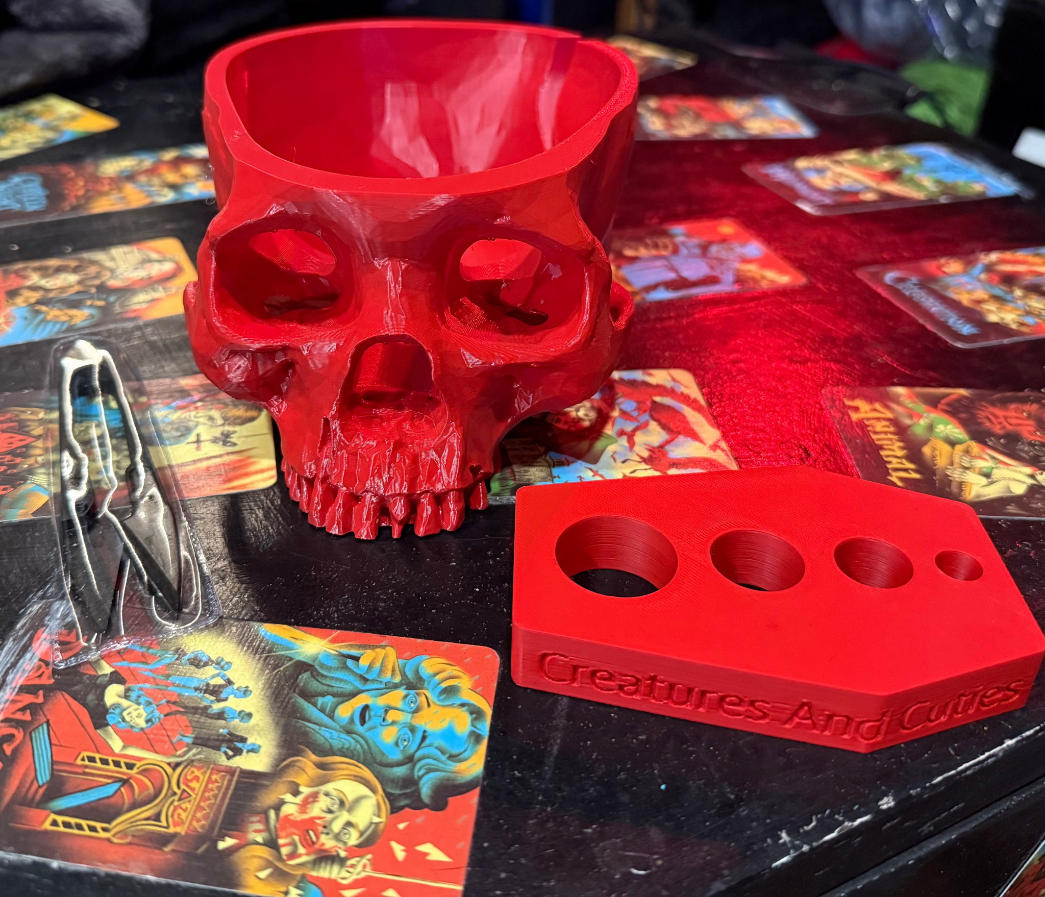 Level up your crafting coven with this sinister little set made for makers who love things creepy and cute. This bundle includes a glossy red skull yarn bowl, a matching Creatures & Cuties safety-eye sizing jig, and sleek black thread snips — perfect for crochet, amigurumi, plush work, and other undead creations.