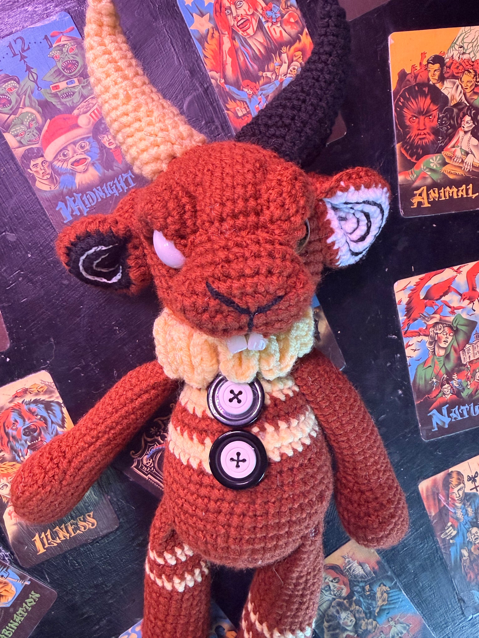 Meet Vinny the Goat, a delightfully odd little creature who looks like he wandered straight out of a spooky storybook. With his mismatched horns, button details, and mischievous grin, Vinny has a personality all his own — equal parts creepy and cuddly.