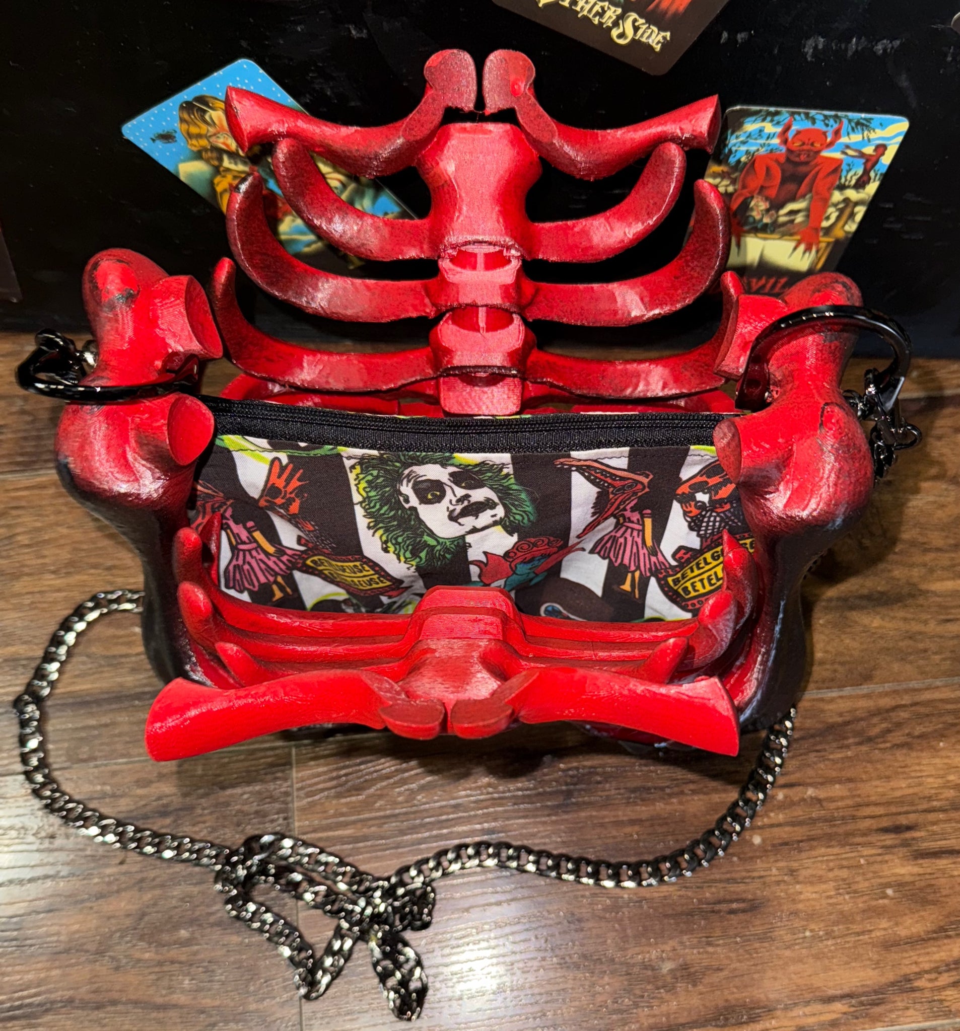 Turn heads (and maybe raise the dead) with this bright red and black ribcage bag — a bold mix of spooky and statement. With its glossy bones, striped Beetlejuice lining, and black chain strap, it’s the perfect accessory for creatures who love to stand out in the dark.