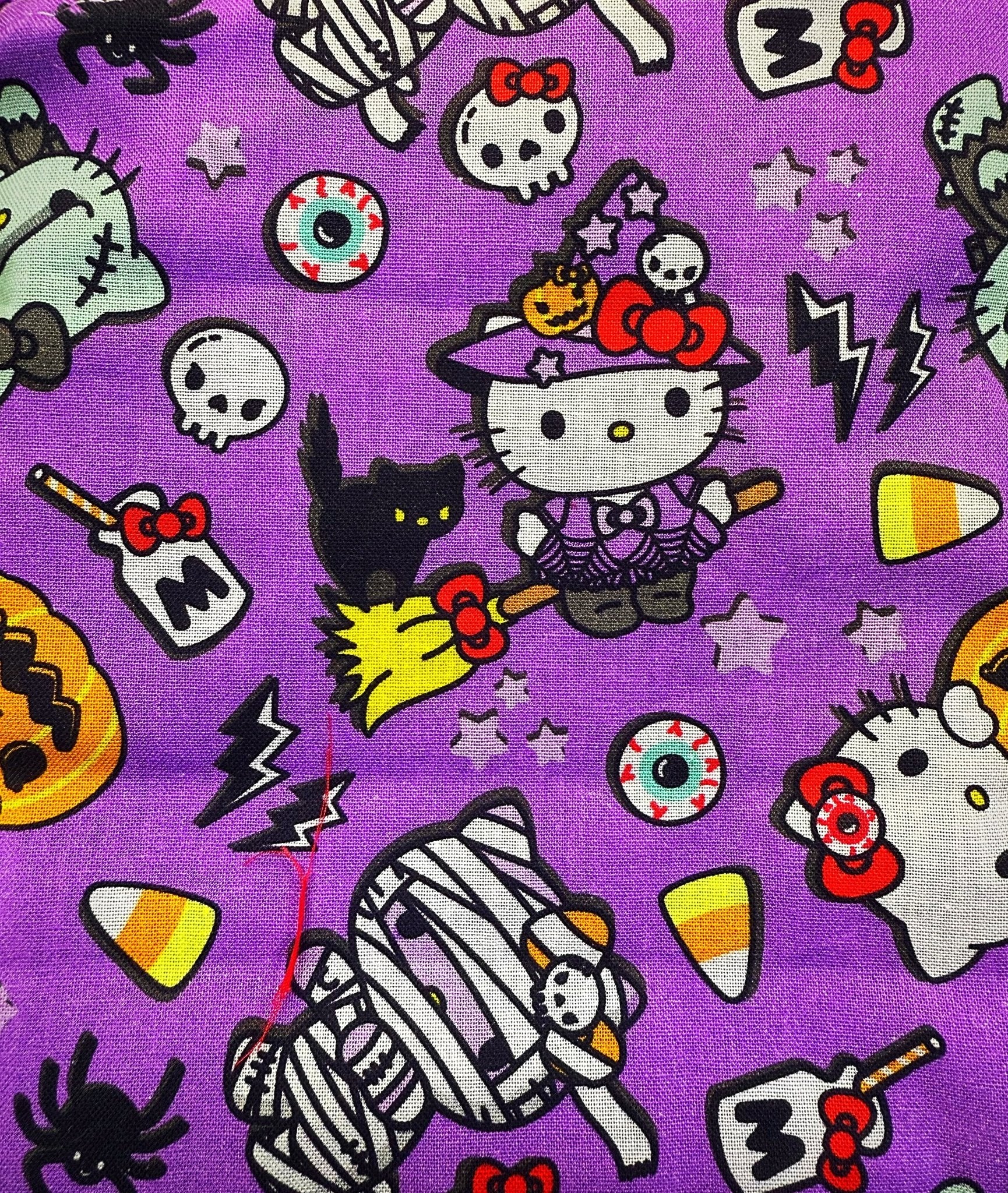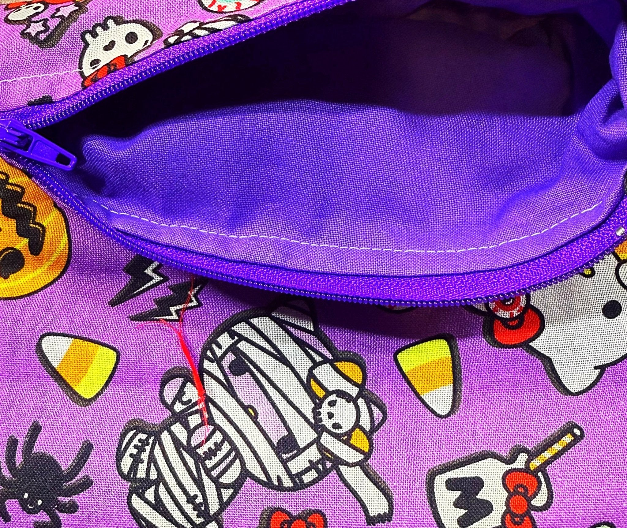 This lining features a lively purple background with a playful Halloween twist—candy corn, pumpkins, spiders, and mummy bears mingle with Hello Kitty details for a spooky-cute vibe. The inside is finished with a matching purple fabric that feels smooth and comfortable, making it the perfect mix of festive fun and everyday charm.