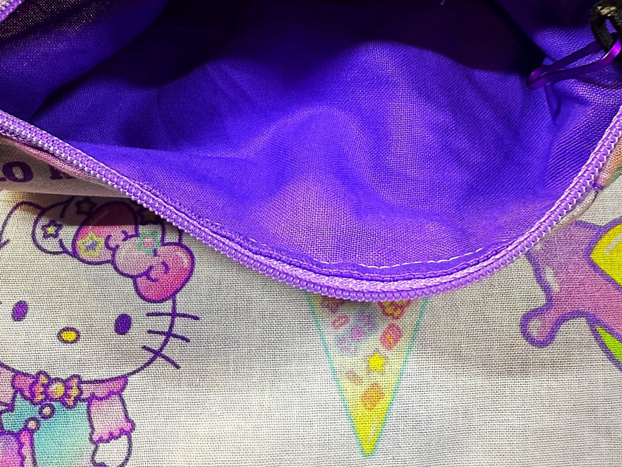 This lining features a pastel cosmic dreamscape with Hello Kitty dressed in whimsical outfits, unicorn horns, and ice cream-inspired designs. The print pops with bright rainbow tones against a soft background, giving it a magical and playful look. The inside is finished with a smooth purple fabric that feels soft to the touch, adding both comfort and charm to your ribcage bag.