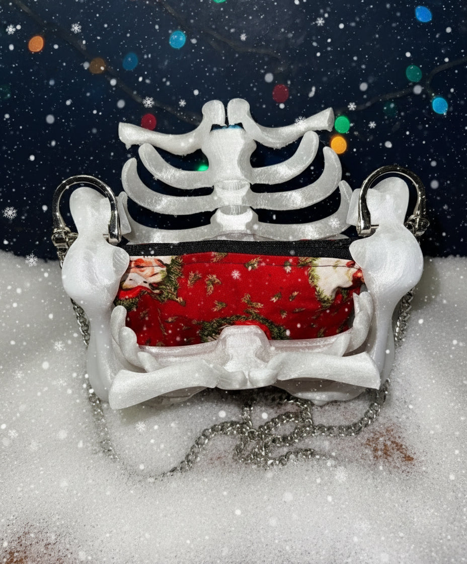 Where spooky meets festive! This bone-white ribcage bag with a crimson Christmas-print lining is perfect for dark souls who still love holiday cheer. A hauntingly merry statement piece for your gothic winter wardrobe.